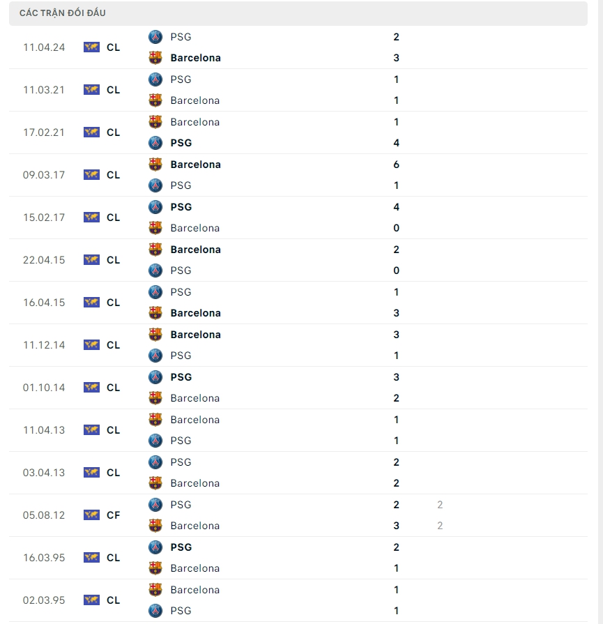 Lịch sử thi đấu của Barcelona vs PSG