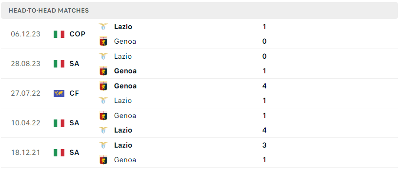 Thành tích đối đầu của Genoa vs Lazio