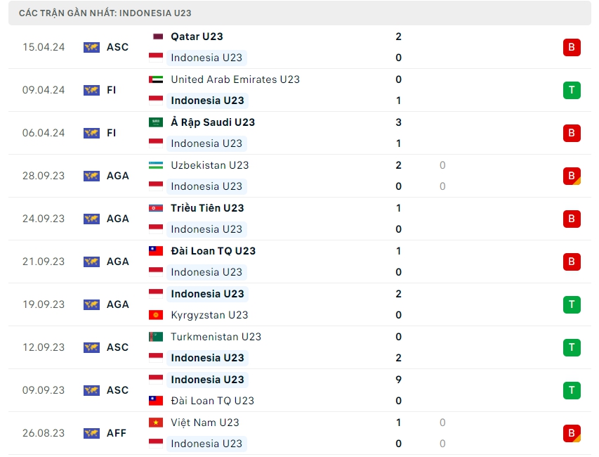 Phong độ đội bóng U23 Indonesia vs U23 Úc