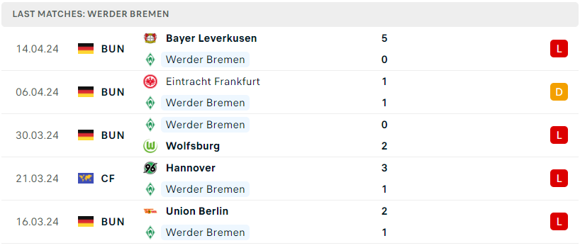 Có vẻ như sự sa sút vẫn cứ liên tục đeo bám đoàn quân HLV Ole Werner, trong 10 lần ra sân gần nhất tại Bundesliga thì họ cũng chỉ mới mang về duy nhất 1 thắng lợi. Đáng ngại hơn, Werder Bremen đã không nếm mùi chiến thắng trong 8 vòng đấu liên tiếp. Trận thua múi mặt 0-5 trước Leverkusen vừa qua gần như là lời đe dọa trực tiếp đến suất trụ hạng của binh đoàn xanh, khi bởi lẽ họ hiện cũng chỉ hơn nhóm cầm đèn đỏ vỏn vẹn 5 điểm.