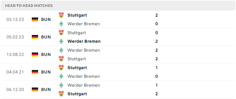 Thành tích đối đầu của Werder Bremen vs Stuttgart