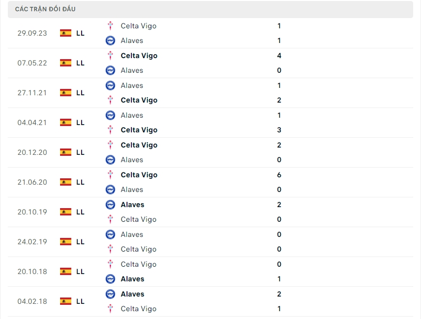 Lịch sử thi đấu của Alaves vs Celta Vigo
