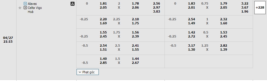 Kèo châu Âu cũng không có sự chênh lệch không quá lớn khi mức ăn của Alaves đang là 2.56 và các vị khách Celta Vigo đang là 2.97 , Rỏ ràng có thể thấy đây là một sự cân bằng nhất định, ở 5 lần chạm mặt nhau gần nhất trên sân của Alaves thì cả hai cũng tạo ra một thống kê cân bằng khi mỗi bên có được 2 chiến thắng và 1 hòa, lần này cũng sẻ không ngoại lệ, một kết quả hòa là hợp lý cho cả hai.