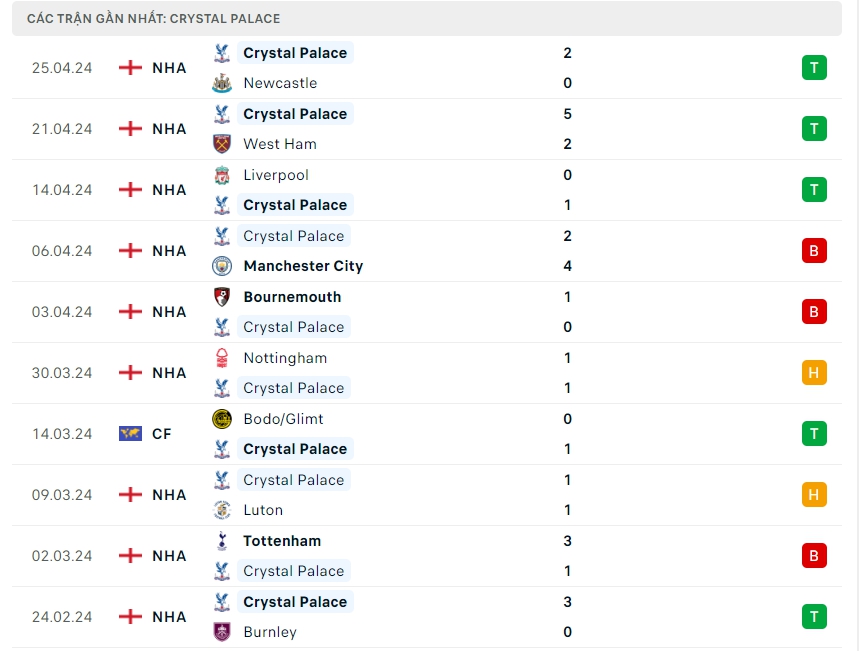 -Phong độ Crystal Palace