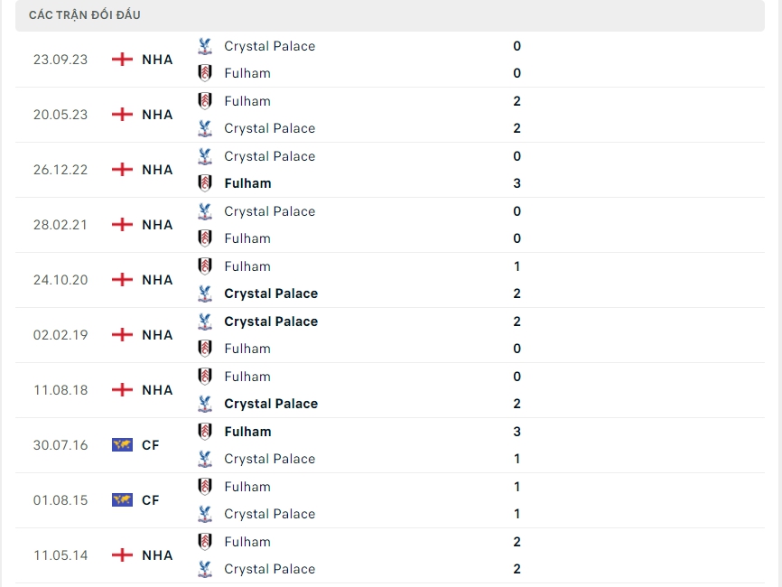 Lịch sử thi đấu của Fulham vs Crystal Palace