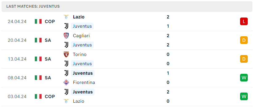 Chuỗi trận sa sút vẫn chưa có dấu hiệu dừng lại khi Juventus tiếp tục gây thất vọng bằng việc đã trải qua đến 3 trận đấu liên tiếp toàn hòa và thua. Thống kê cho thấy, ở 10 lần ra sân gần nhất thì Lão Bà cũng chỉ mang về vỏn vẹn 3 chiến thắng và từ một ứng viên cho cuộc đua danh hiệu giờ đây đang phải vật lộn với cuộc chiến top 4. Với điểm số ở hiện tại thì Juventus rõ ràng cũng không còn mục tiêu gì và trận đấu với AC Milan sắp tới chỉ mang ý nghĩa về tinh thần, trước khi bước vào trận chung kết với Atalanta.