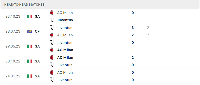Thành tích đối đầu của Juventus vs AC Milan
