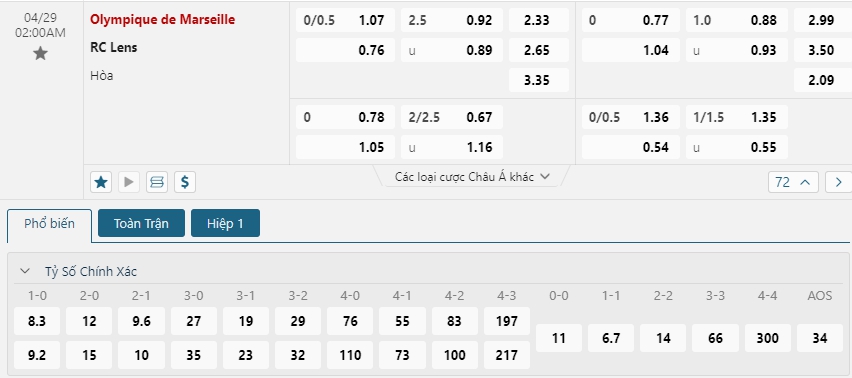 Kèo châu Âu cũng đang là sự ưu thế nhỏ cho đội chủ nhà khi mức ăn của Marseille đang là 2.33 trong khi đó con số này của đội khách Lens đã là 2.65. Một trận đấu mà tương quan về mặt chất lượng nhân sự cùng với đó là màn trình diễn gần đây có phần khá giống nhau đến từ hai đội. Nhiều khả năng trận đấu diễn ra khá cân bằng nhưng với sự già dơ và sự tự tin khi hành quân đến sân của đối thủ thì Lens sẻ là đội bóng có được cho mình chiến thắng sau cùng.