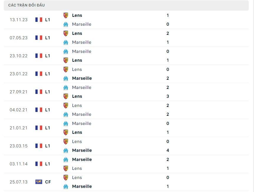 Lịch sử thi đấu của Marseille vs Lens