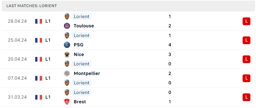 Bên phía kia, những trận thua liên tiếp vừa qua đã đẩy Lorient rơi xuống vị trí áp chót trên BXH và hiện đang còn kém nhóm an toàn 3 điểm. Dù trước đó đoàn quân Régis Le Bris đã nắm giữ lợi thế cực lớn trong cuộc chiến trụ hạng, thế nhưng càng thi đấu sự yếu kém của họ càng lộ ra và điều này khiến Lorient đang đứng trước nguy cơ rớt hạng. Những thách thức vẫn chưa dừng lại tại đây khi tập thể vùng Bretagne sẽ phải hành quân đến sân của Lens ở vòng đấu kế tiếp.
