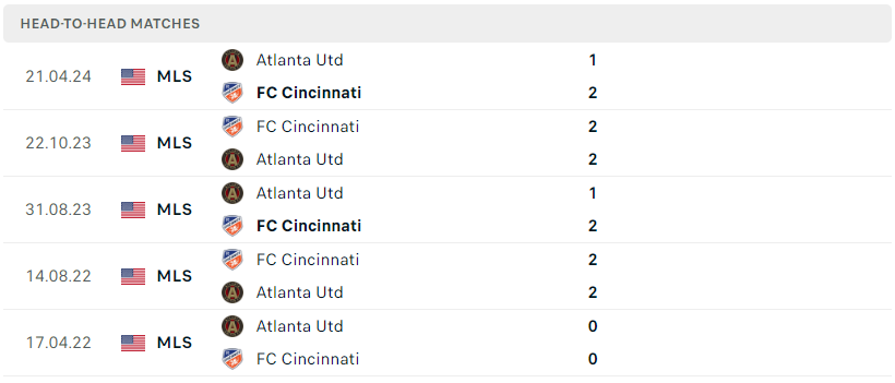 Thành tích đối đầu của FC Cincinnati vs Atlanta Utd
