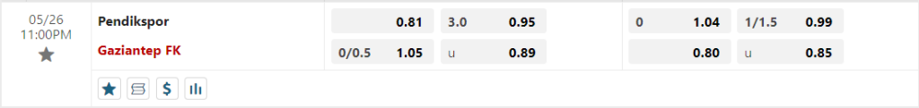 Với thực lực có phần nhỉnh hơn cùng tâm thế cửa trên, Gaziantep vẫn đang là cái tên nhận được sự ưu ái trong kèo đấu này, qua mức giá niêm yết trên sàn giao dịch là 0.25. Bất chấp việc phải làm khách, tuy nhiên với thực lực cùng sự thỏa mái về tâm lý Gaziantep vẫn có quyền chơi chủ động. Chưa kể, phong độ của họ trong những vòng đấu vừa qua thực tế cũng chẳng thua kém gì so với Pendikspor và thậm chí là có phần vượt trội hơn. Trên sân khách, Gaziantep cũng vừa đánh đấu sự trở lại với màn hủy diệt 6-1 ngay tại sân của Adana Demirspor, đó chính là cơ sở để họ tiếp tục có thể mơ về một thắng lợi trong chuyến hành quân sắp tới. Chính vì những thống kê vượt trội đó, hoàn toàn có thể lựa chọn cửa trên trong kèo Châu Á.