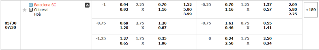Với điểm tựa sân nhà cùng thực lực vượt trội thì không quá bất ngờ khi Barcelona SC hiện vẫn đang là cái tên nhận được sự ưu ái trong kèo đấu này, qua mức giá niêm yết trên sàn giao dịch là 1.0. Dù đang thi đấu không mấy hiệu quả và ổn định, song xét về sức mạnh Barcelona SC vẫn nhỉnh hơn Cobresal một bậc. Chưa kể, sân nhà cũng đang là điểm tựa tương đối vững chắc của đại diện Ecuador, khi họ đã bất bại đến 4/5 trận đấu gần nhất và thậm chí chỉ thua 1 sau 9 trận đấu kể từ đầu mùa. Ngược lại, không những sa sút và xuống phong độ, Cobresal cũng lộ rõ bản chất là tập thể thiếu kinh nghiệm sân khách, 9 trận toàn hòa và thua ở 10 lần hành quân là một minh chứng. Chính vì lẽ đó, hoàn toàn có thể đặt niềm tin vào đội chủ nhà ở kèo Châu Á.