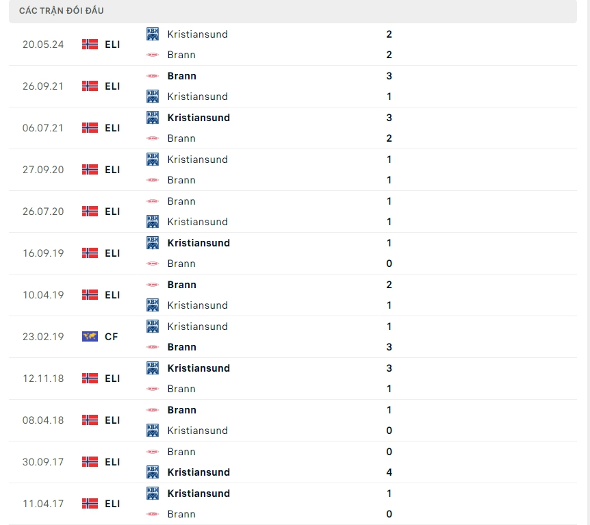 Lịch sử thi đấu của Brann vs Kristiansund