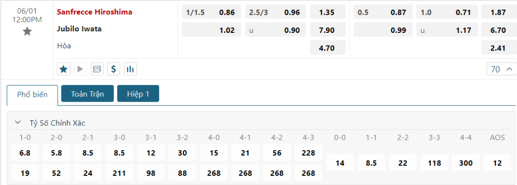Bảng tỷ lệ kèo bóng đá trận đấu Sanfrecce Hiroshima vs Iwata