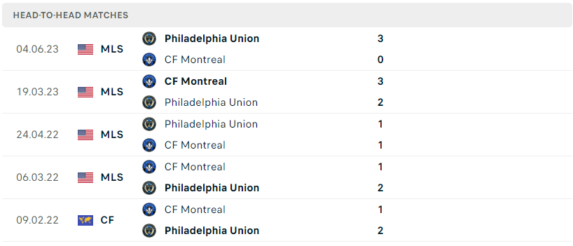 Thành tích đối đầu của Philadelphia Union vs CF Montreal