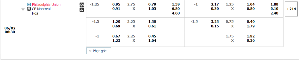 Bảng tỷ lệ kèo bóng đá trận đấu Philadelphia Union vs CF Montreal