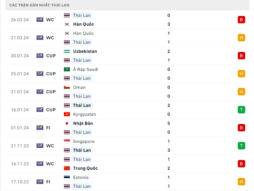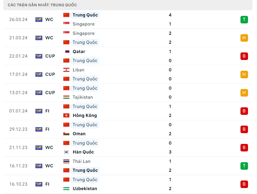 Phong độ đội bóng Trung Quốc vs Thái Lan