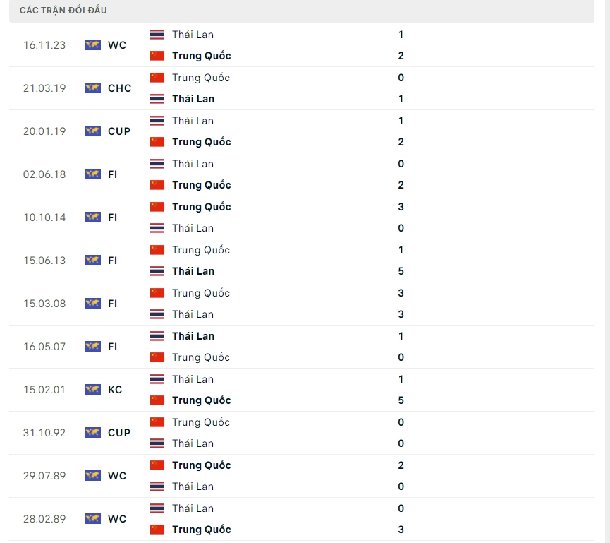 Lịch sử thi đấu của Trung Quốc vs Thái Lan