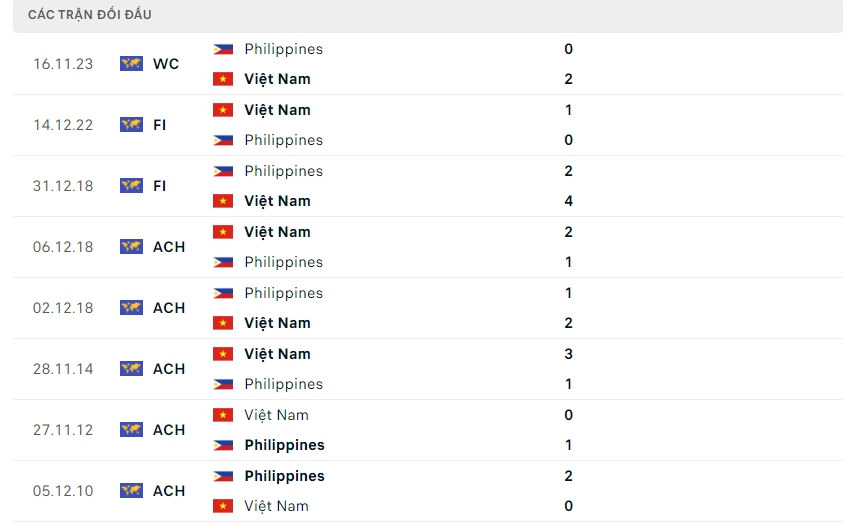 Lịch sử thi đấu của Việt Nam vs Philippines
