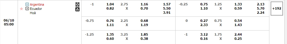 Kèo châu Âu cũng sẻ là ưu thế cho các cầu thủ Argentina khi mức ăn của họ đang là 1.57 và các cầu thủ Ecuador đang là 5.50. Một trận đấu mà tương quan lực lượng, phong độ và lịch sử đối đầu đều đang nghiêng hẳn về các nhà ĐKVĐ thế giới, trong 10 lần gần nhất chạm mặt, Argentina thắng đến 6, hòa 3 và chỉ thua 1 trước đối thủ, lựa chọn Argentina cho kèo Châu Âu.