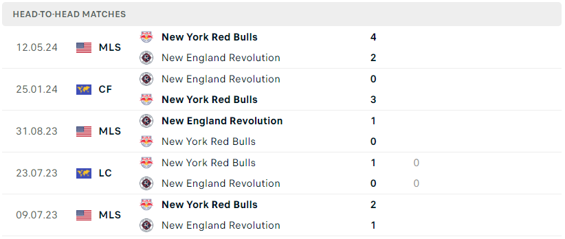Thành tích đối đầu của New England Revolution vs New York Red Bulls