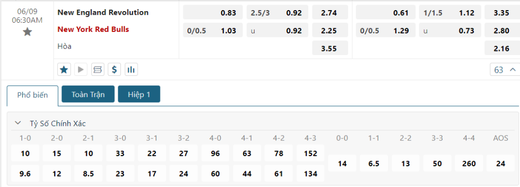 Bảng tỷ lệ kèo bóng đá trận đấu New England Revolution vs New York Red Bulls