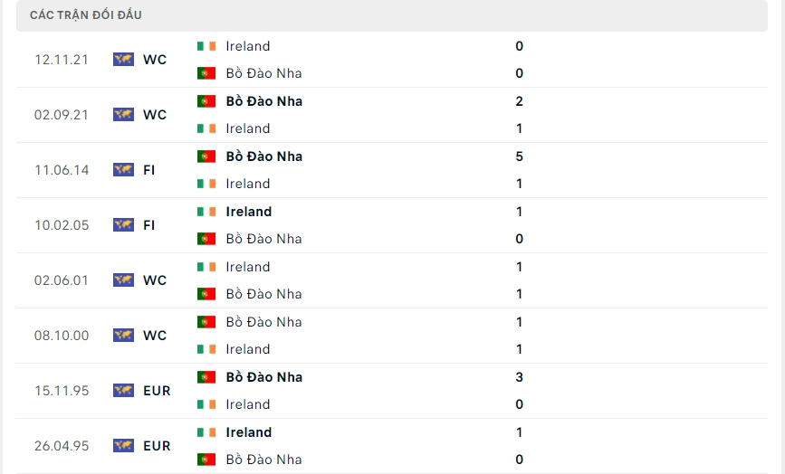 Lịch sử thi đấu của Bồ Đào Nha vs Ireland