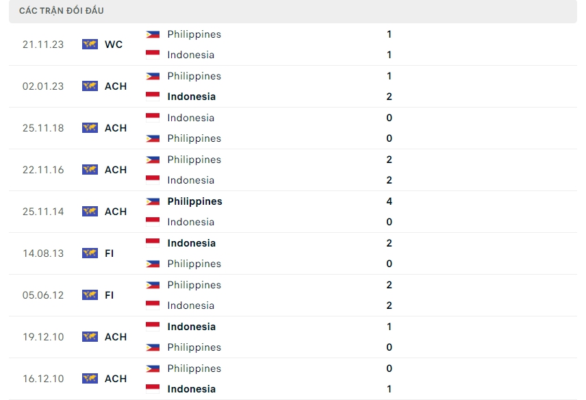 Lịch sử thi đấu của Indonesia vs Philippines