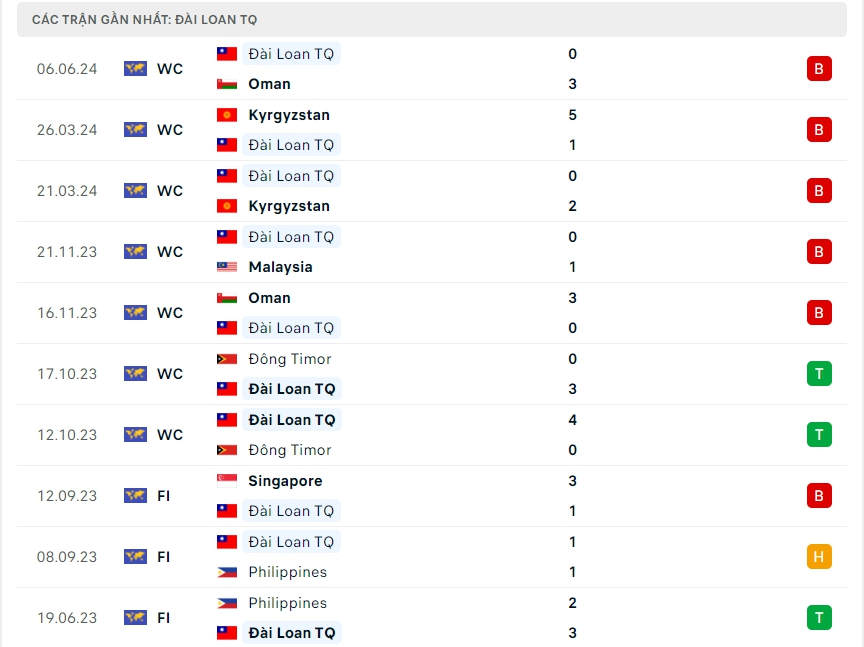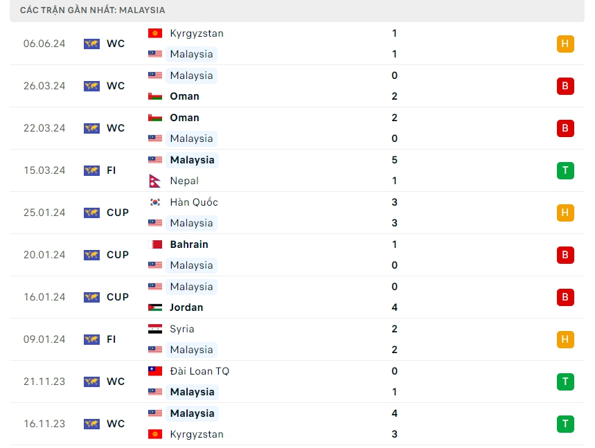 Phong độ đội bóng Malaysia vs Đài Loan