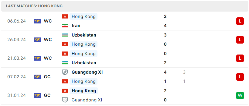 Bên phía đối diện, Hồng Kông Trung Quốc cũng đang phải chịu cảnh tương tự khi họ cũng chỉ mang về đúng 1 điểm sau 5 lượt trận và hiện đang xếp cuối cùng trên BXH do để lọt lưới đến 15 bàn thua. Việc thuận lợi vượt qua vòng sơ loại để góp mặt tại bảng đấu được đánh giá là “không cân sức” này cũng được xem là sự thành công dành cho họ. Sự non nớt và thiếu kinh nghiệm của nhân sự cùng lối đá kém “hiện đại” là điều có thể dễ dàng nhận thấy sau khi Hồng Kông trải qua 5 trận đấu.