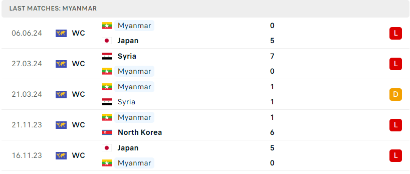 Thành tích đối đầu của Triều Tiên vs Myanmar