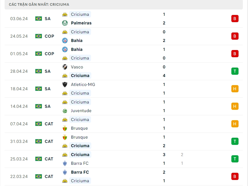 Trong khi đó với Criciuma, họ không được đánh giá cao tại giải VĐQG Brazil, với 4 trận đã đấu có được 5 điểm và đang xếp vị trí thứ 16 trên BXH, hàng công của các vị khách Criciuma thi đấu khá tròn vai với 7 bàn thắng có được, bên cạnh hàng thủ nhận 4 bàn thua, 5 trận xa nhà gần nhất hàng công của Criciuma mang về 8 bàn thắng và hàng thủ nhận 5 bàn thua.