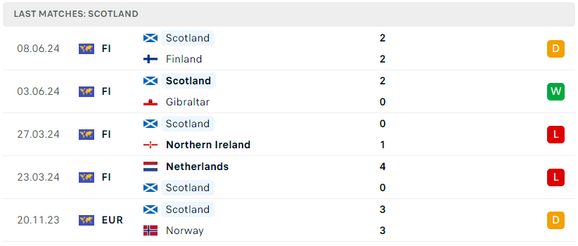 Phía bên kia, đội tuyển Scotland đến với Euro 2024 với thành tích xếp thứ 2 tại vòng loại trong bảng đấu có sự hiện diễn của Tây Ban Nha, Na Uy và Georgia. Scotland đã xuất sắc giành 5 chiến thắng, 2 trận hòa và 1 thất bại, đáng chú ý trong 5 chiến thắng đó có 1 chiến thắng trước đội tuyển Tây Ban Nha. Với những gì đã và đang thể hiện, Scotland chắc chắn sẽ mang vai trò của “kẻ thách thức” tại bảng A. Dù phải gặp Đức ở trận ra quân, nhưng cơ hội vẫn hoàn toàn rộng mở dành cho họ.