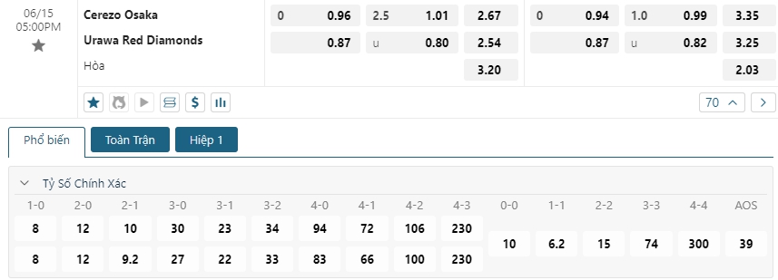 Bảng tỷ lệ kèo bóng đá trận đấu Cerezo Osaka vs Urawa Red Diamonds
