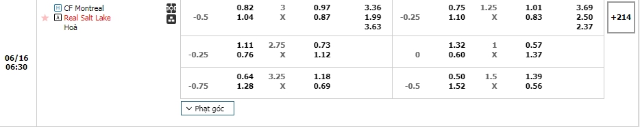 Bảng tỷ lệ kèo bóng đá trận đấu CF Montreal vs Real Salt Lake