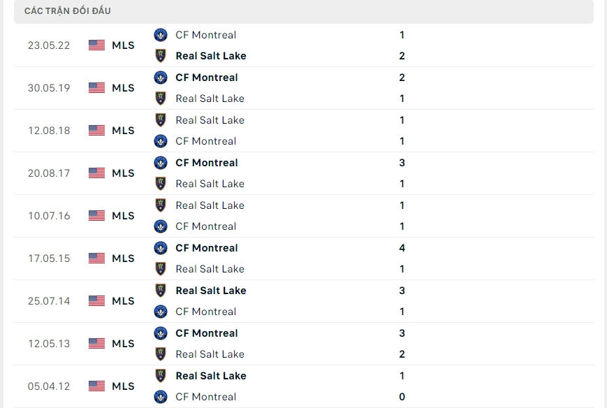 Lịch sử thi đấu của CF Montreal vs Real Salt Lake