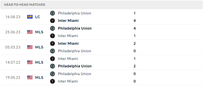 Thành tích đối đầu của Philadelphia Union vs Inter Miami