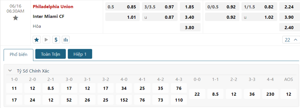 Bảng tỷ lệ kèo bóng đá trận đấu Philadelphia Union vs Inter Miami