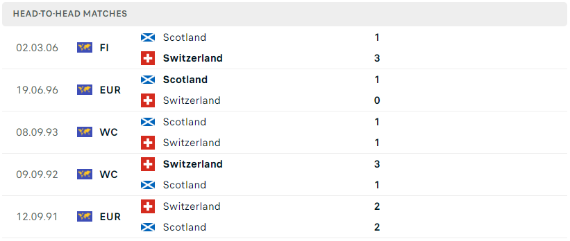 Thành tích đối đầu của Scotland vs Thụy Sỹ