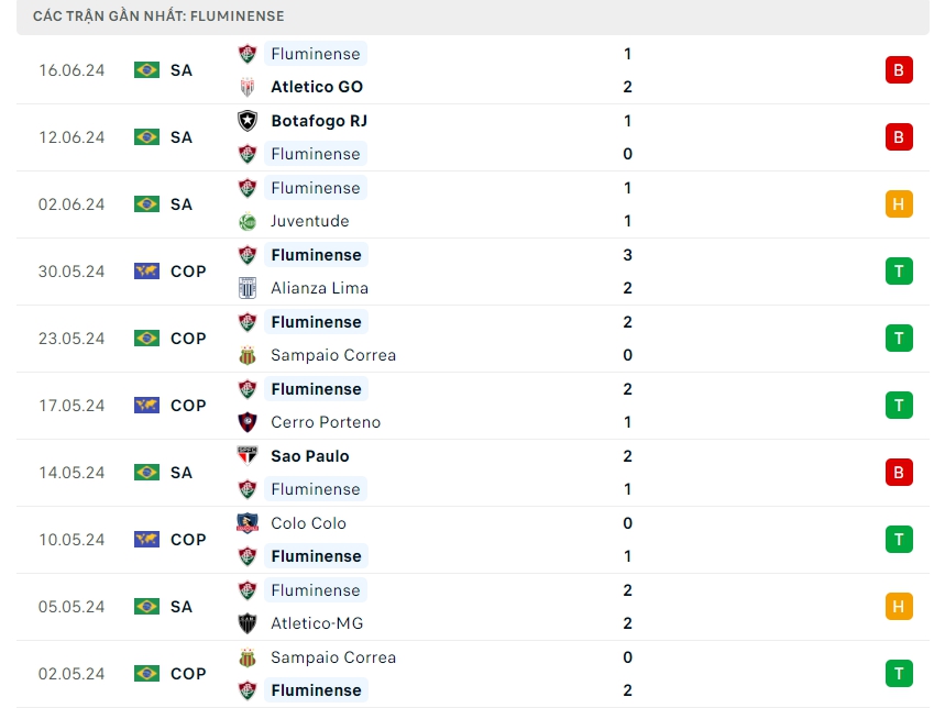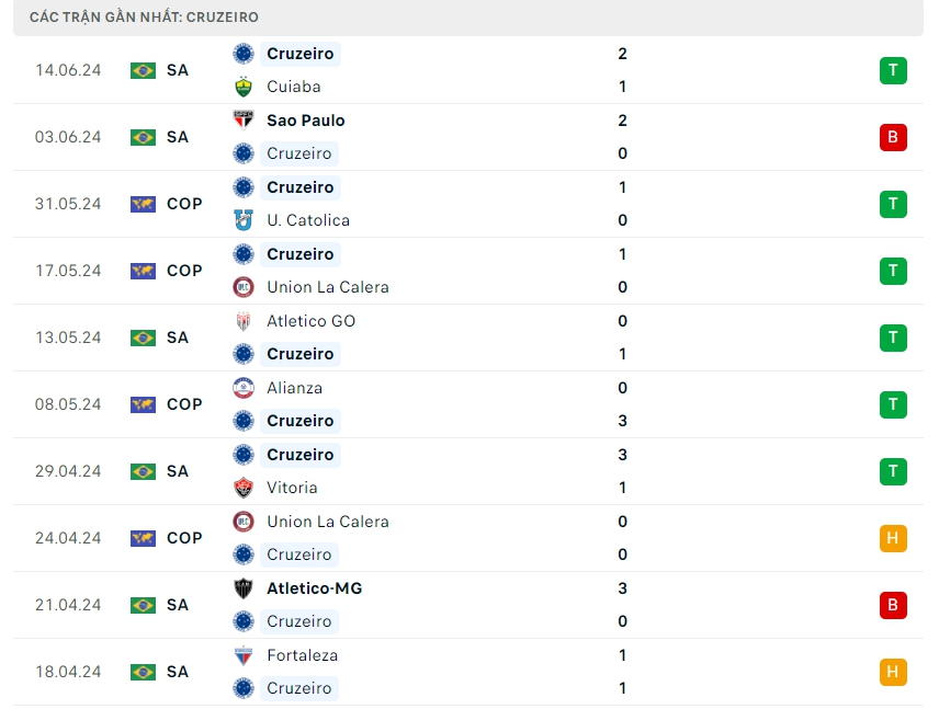 Phong độ đội bóng Cruzeiro vs Fluminense