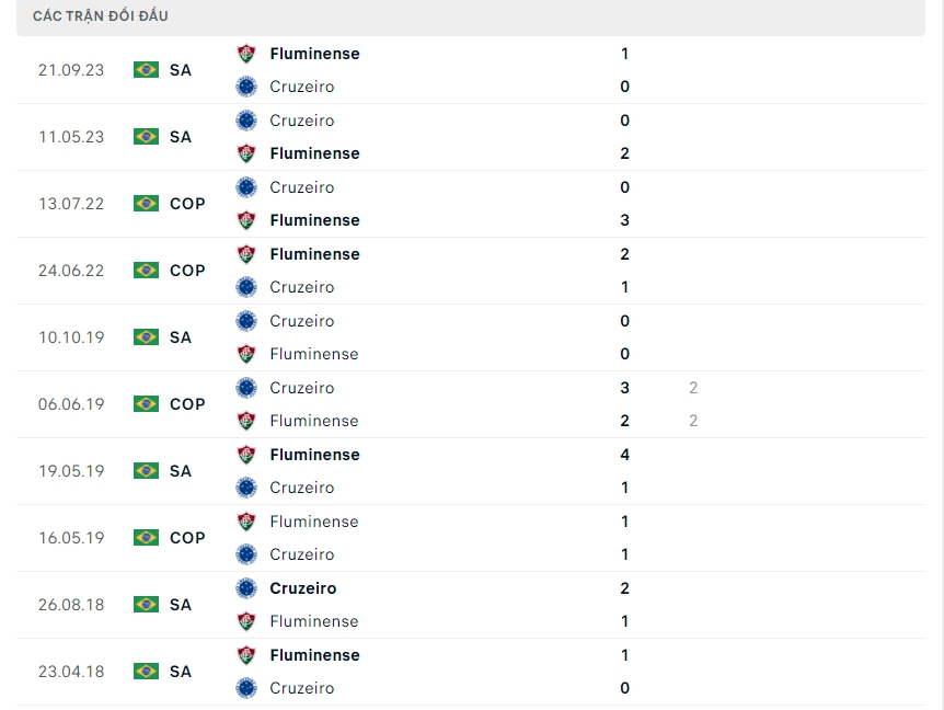Lịch sử thi đấu của Cruzeiro vs Fluminense