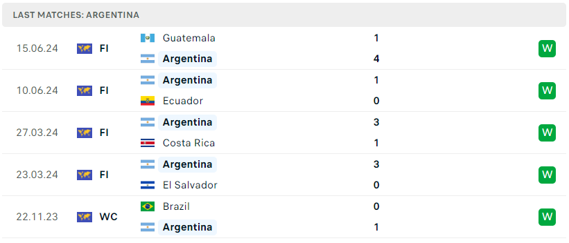 Để chuẩn bị cho chiến dịch Copa America sắp tới, nhà ĐKVĐ Argentina cũng đã cho thấy được tham vọng của họ khi đã trải qua 2 trận đấu giao hữu với Ecuador và Guatemala với thành tích toàn thắng. Đáng nói, kể từ sau chức vô địch World Cup 2022, phong độ của đoàn quân Lionel Scaloni chẳng hề sa sút và bằng chứng là việc họ vẫn đang dẫn đầu BXH vòng loại World Cup khu vực Nam Mỹ. Với vị thế của nhà ĐKVĐ, Argentina chắc chắn sẽ bước đến giải đấu này với tối đa sự quyết tâm.