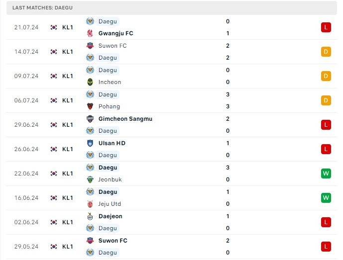 Daegu vừa nhận thất bại trước Gwangju FC, đây là trận không thắng thứ 6 liên tiếp của họ, trong đó có 3 hòa và 3 thất bại, trải qua 24 lượt trận Daegu có được 23 điểm và đang xếp vị trí thứ 11 trên BXH, hàng công của Daegu mang về 23 bàn thắng, bên cạnh hàng thủ chơi tệ khi nhận đến 32 bàn thua, 5 trận gần nhất được thi đấu trên sân nhà hàng công của Daegu mang về 7 bàn thắng và hàng thủ nhận 4 bàn thua, 3/5 trận đó khép lại 90 phút không quá 2 bàn thắng.