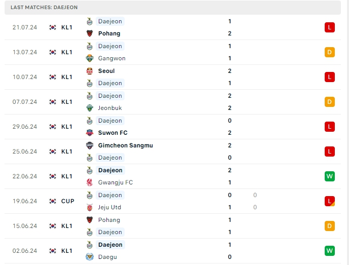 Phong độ đội bóng Daegu vs Daejeon Citizen