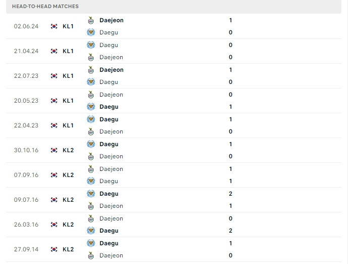 Lịch sử thi đấu của Daegu vs Daejeon Citizen