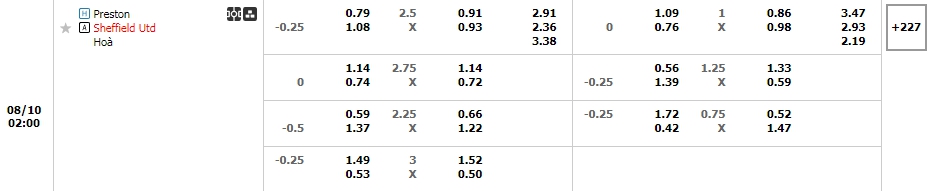 Với thực lực nhỉnh hơn thì bất chấp việc không được chơi trên sân nhà, Sheffield Utd hiện vẫn đang là cái tên nhận được sự ưu ái trong kèo đấu này với mức giá là 0.25. Một con số tuy không quá nhiều nhưng nó đủ để thấy được binh đoàn áo đen trắng vẫn tỏ ra nhỉnh hơn đối thủ ở thời điểm hiện tại. Sheffield Utd đang có được sự chuẩn bị ấn tượng bằng những chiến thắng liên tiếp trong những trận giao hữu vừa qua và việc là đội bóng từ đấu trường cao nhất là EPL rơi xuống chắc chắn vẫn được đánh giá cao, trong khi chủ nhà Preston North End không có được phong độ tốt và trên sân nhà của mình Preston North End cũng đang chơi tệ với chỉ 1 chiến thắng và 4 thất bại ở 5 trận vừa qua, một điều mà NHM Preston North End cần phải lo lắng là những lần đụng độ với Sheffield Utd thì đội bóng của họ đều nhận những kết quả tệ với chỉ 1 chiến thắng, 2 hòa và 2 thất bại trước đối thủ.