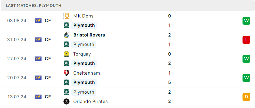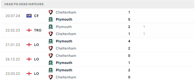 Trong cả 5 lần đụng độ gần nhất thì Plymouth Argyle cũng đã toàn thắng trước Cheltenham Town, đáng nói trong cuộc đụng độ giao hữu 1 tháng trước thì đội chủ sân Home Park cũng đã nhẹ nhàng đánh bại đối thủ với tỉ số 5-1. Nhiêu đó thôi cũng đã đủ để thấy được phần nào sức mạnh của đoàn quân Wayne Rooney. Sức mạnh sân nhà cùng với thực lực vốn có, Plymouth vẫn sẽ nhẹ nhàng ghi tên vào vòng kế tiếp.