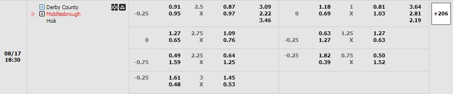 Lợi thế sân nhà cũng không thể giúp Derby County được đánh giá cao trong trận đấu này, mà những người được đánh giá nhỉnh hơn là các vị khách Middlesbrough với mức kèo chấp mà nhà cái đưa ra là 0.25, Việc có được khởi đầu thuận lợi và có được sự chuẩn bị kỹ lưỡng cho mùa giải năm nay đang giúp Middlesbrough được đánh giá cao và có được sự tự tin, đặc biệt họ cũng đang chơi rất tốt khi phải hành quân xa nhà với thành tích 3 chiến thắng, 1 hòa và chỉ 1 thất bại ở 5 trận đã qua, bên kia sân chủ nhà Derby County đã không có được sự chuẩn bị tốt khi liên tục nhận thất bại ở loạt giao hữu và khiến họ tiếp tục đón nhận thất bại ở ngày khai màn giải đấu, Derby County chắc chắn sẻ tiếp tục đối diện với nhiều khó khăn dù có ưu thế sân nhà trong tay.