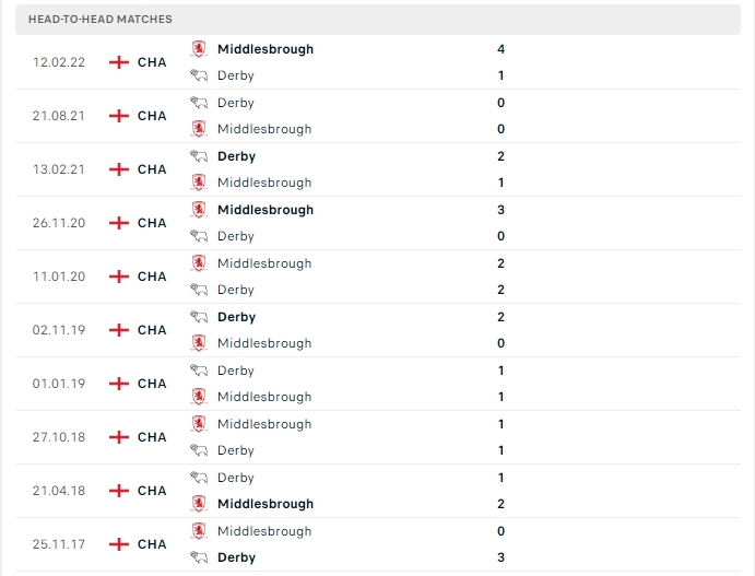 Lịch sử thi đấu của Derby County vs Middlesbrough